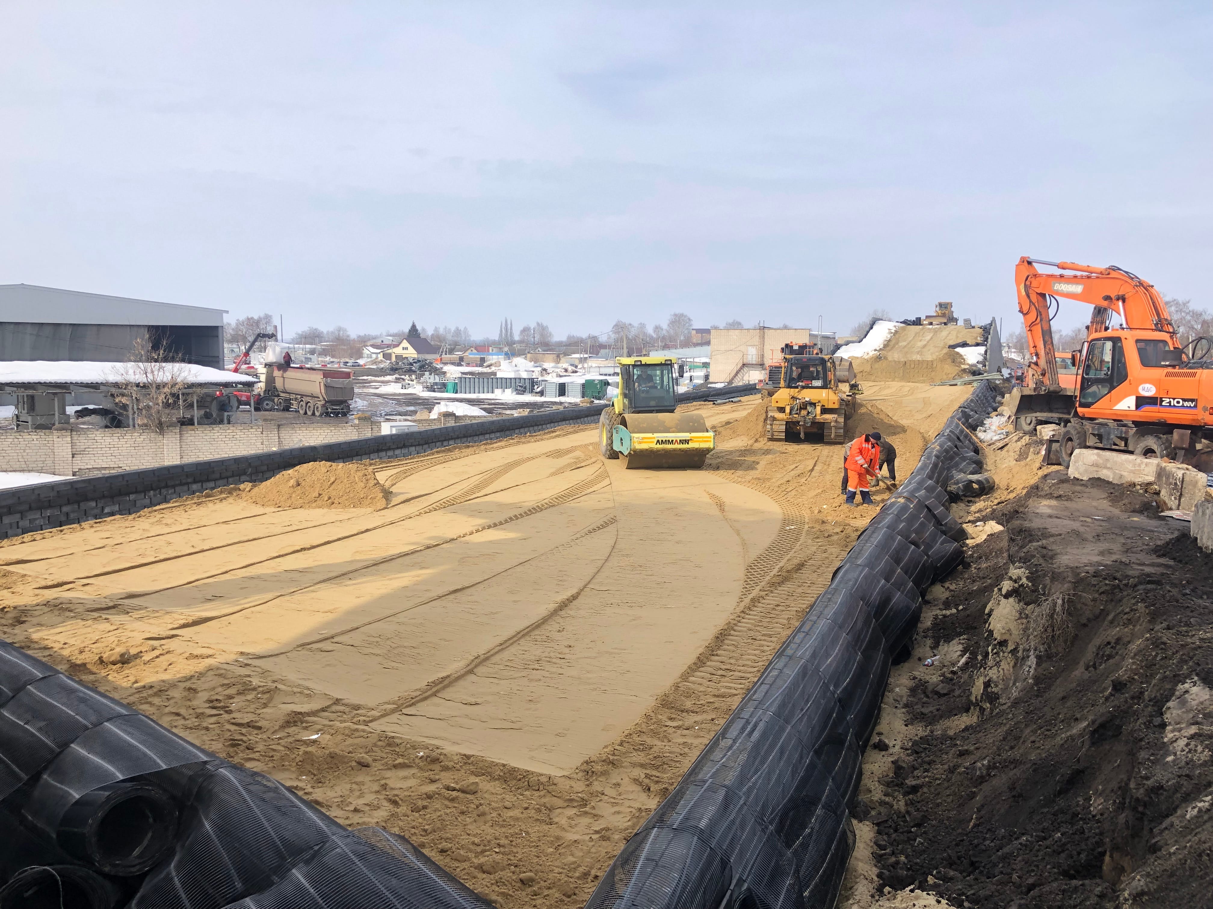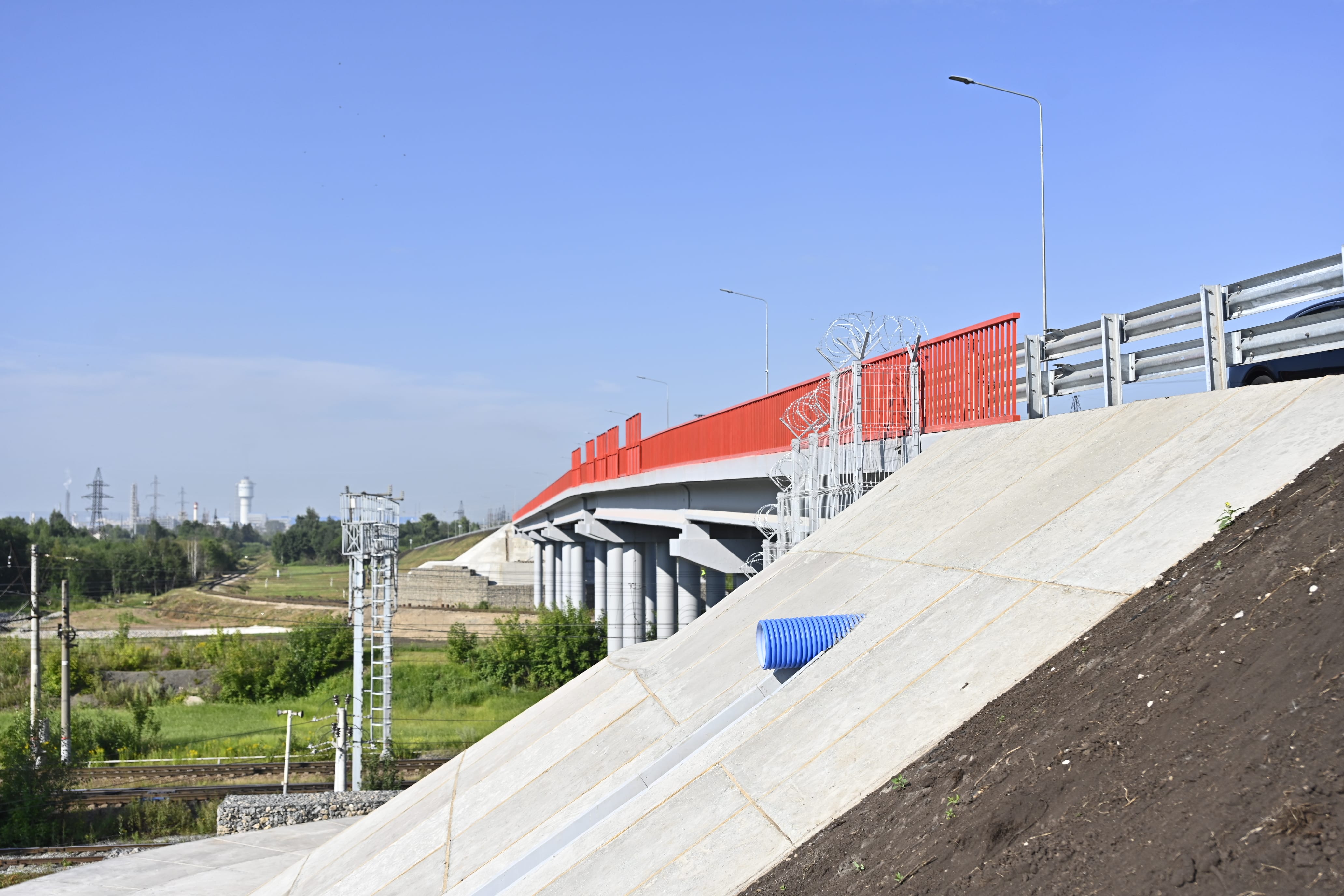 Параллельно ведутся работы по устройству подпорных стен, прокладке водоотводных систем, переустройству линий электропередачи и газопровода. Также продолжается устройство опор надземного пешеходного перехода.
