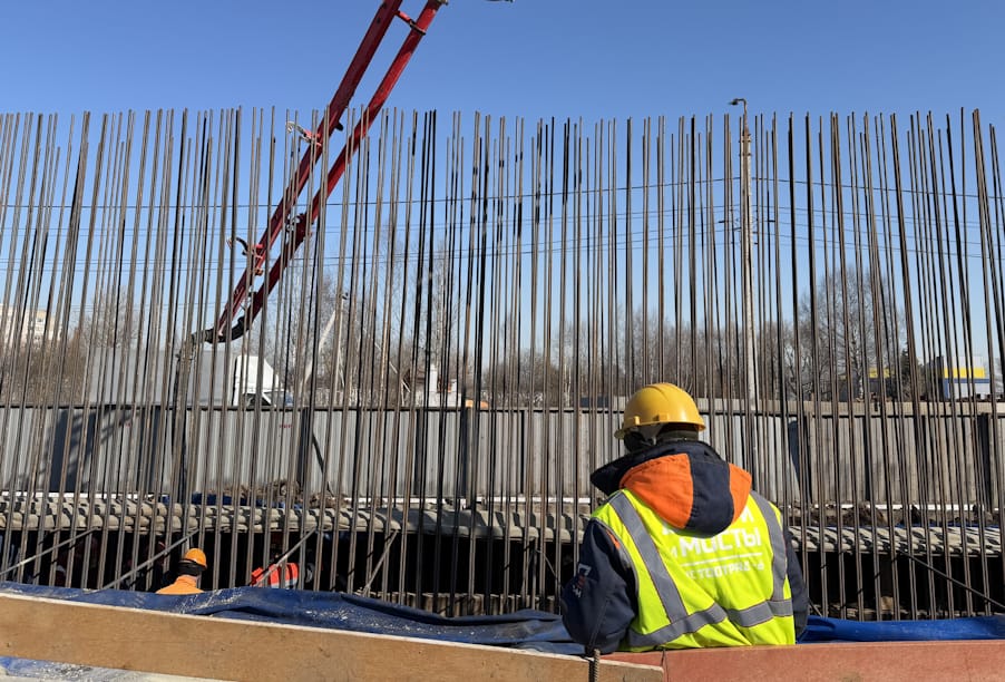 Первая опора самая широкая на эстакадной части моста. Помимо четырех основных полос движения, здесь расположатся переходно-скоростные полосы для съезда и заезда на мост — фактически шесть полос. Фундамент опирается на 56 буронабивных свай диаметром 80 см каждая. Качество свай проверяется ультразвуковой дефектоскопией: специальные датчики сканируют бетон изнутри и выявляют даже минимальные дефекты. Проектную прочность бетон набирает за 28 суток.
